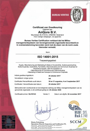 AnQore heeft het ISO 14001:2015 certificaat ontvangen. Deze norm specificeert de eisen voor een milieumanagementsysteem waarmee een organisatie haar milieuprestaties kan verbeteren.