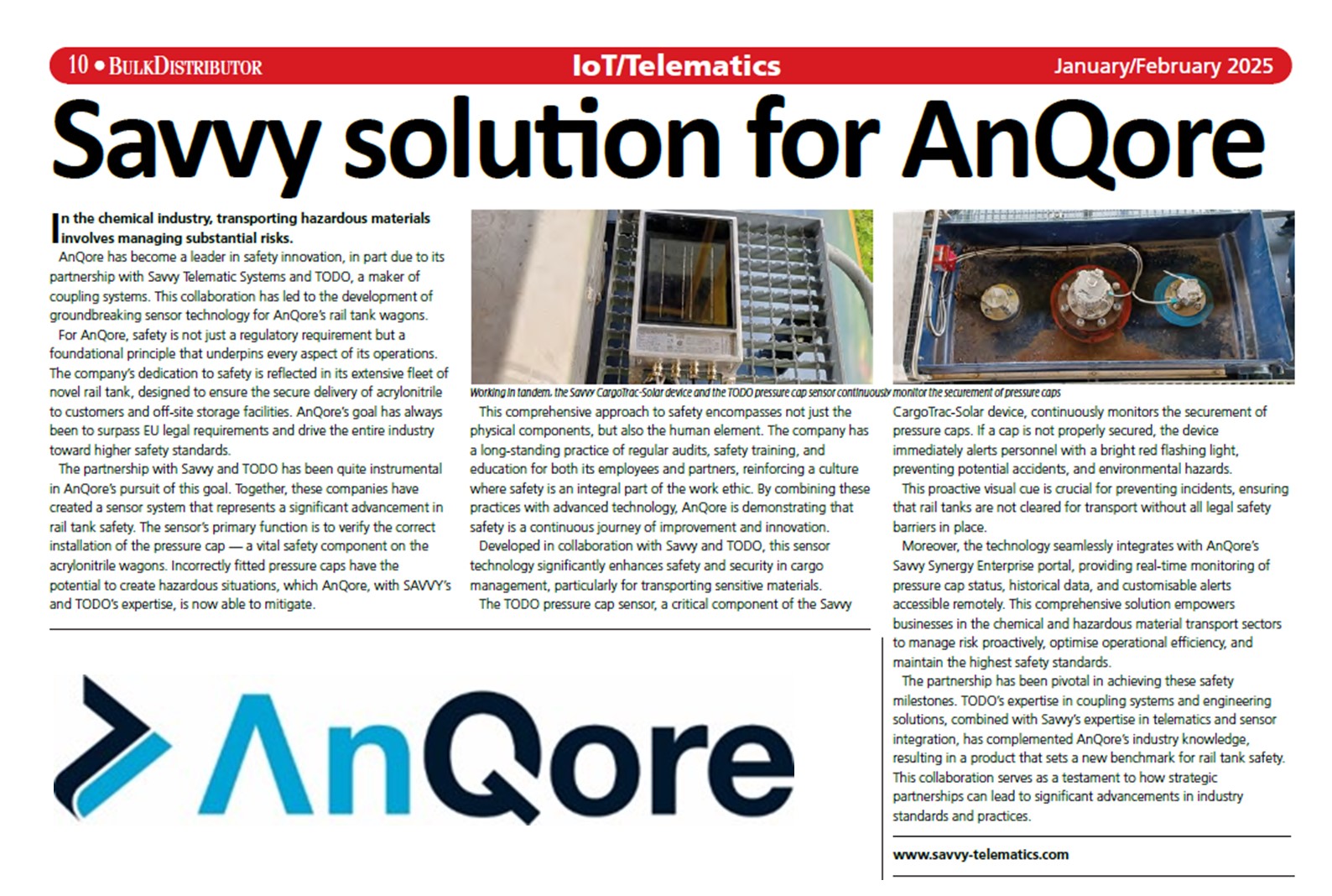 Al meer dan 30 jaar informeert en verbindt Bulk Distributor een wereldwijd publiek van senior besluitvormers in de bulklogistiek toeleveringsketen. Dit vooraanstaande vakblad besteedt in haar uitgave van januari / februari 2025 prominent aandacht aan de innovatieve oplossing die door AnQore in samenwerking met haar partners Savvy Telematics Systems en TODO (maker van koppelingssystemen) is ontwikkeld. De genoemde bedrijven ontwikkelden gezamenlijk een sensor die het mogelijk maakt om te monitoren of de verplichte "pressure caps" (correct) zijn aangebracht, voordat het transport van gevaarlijke goede goederen van start gaat. Deze extra kap dient om een eventuele emissie van gevaarlijke goederen, die kan ontstaan wanneer een van de afsluiters niet goed functioneert, te voorkomen.